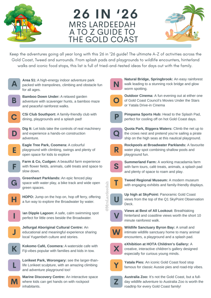 Keep the adventures going all year long with this 26 in ‘26 guide! The ultimate A–Z of activities across the Gold Coast, Tweed and surrounds. From splash pads and playgrounds to wildlife encounters, hinterland walks and iconic food stops, this list is full of tried-and-tested ideas for days out with the family.