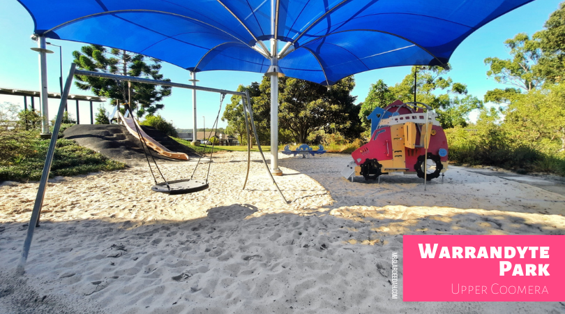 Warrandyte Park at Upper Coomera is a fun truck themed park with a great slide! Built on a hill, the playground is on one level and follow a short path up the hill, you'll find a picnic shelter with views over the playground and access to the slide.