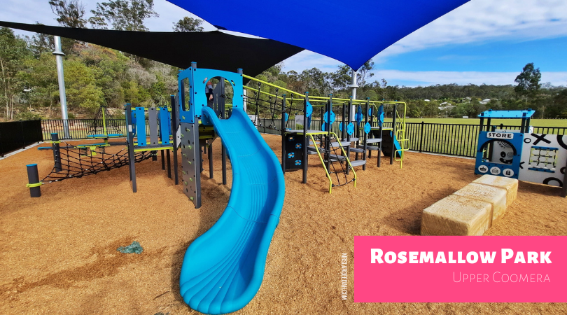 Rosemallow Park at Upper Coomera is home to a fantastic, fully fenced playground next to a huge grassy field, perfect for kicking a ball around! The playground is quite sprawling, with plenty of climbing opportunities, imaginative play in the shop front, swings, musical instruments, a see saw and a slide.