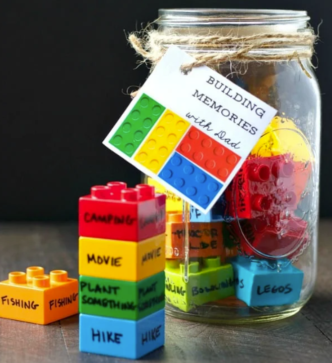 Have you got some Duplo or Lego bricks lying around at home? Get the kids to come up with a list of activities they love to do with Dad, and write them onto the bricks. Pop them in the jar and get the kids to decorate a special tag that explains this gift is about building memories with Dad! As they work through the bricks over time, they can build memories, and build with Lego until the jar is finished! Idea by The Seasoned Mom