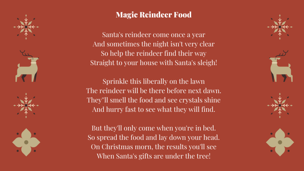 A sprinkle of magic Reindeer Food on Christmas Eve is guaranteed to help Santa and his reindeer find your house to deliver presents! While you can buy some in shops now, it’s not always animal friendly (please, don’t use glitter!!), and it’s so easy to make some yourself instead. Whip some of this up and be sure to sprinkle it on the lawn before bedtime on Christmas Eve.